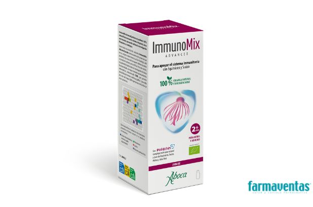 ImmunoMix Advanced jarabe de Aboca es un complemento alimenticio que apoya el sistema inmunitario gracias a Equinácea, Saúco, Malva y Jalea Real que se incluyen en su fórmula con PoliEquin-L®, no solo durante el período invernal, sino en todos los casos en los que se encuentra debilitado. El zumo de Saúco y la Miel le confieren un sabor agradable que lo hace ideal para su administración en niños. No contiene gluten.