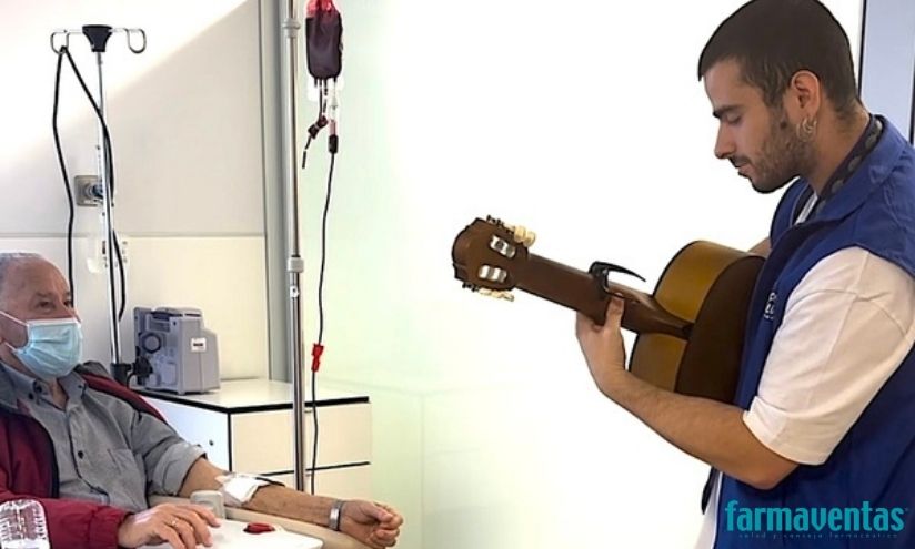 Los voluntarios de la ONG Músicos por la Salud, que colabora con 76 hospitales, ayudan a los pacientes que están recibiento un tratamiento de quimioterapia en ese momento tan difícil.