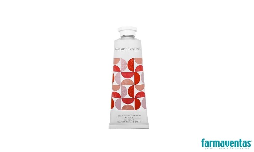 De textura rica y nutritiva, la Crema de manos protectora antiedad de Days of Confidence está pensada para mujeres a partir de 40 años. Incluye un 80% de ingredientes orgánicos y se absorbe rápidamente en la piel. Además, posee un agradable aroma con notas de salida muy frescas de cítricos y hierba cortada, combinadas con delicadas notas medias aromáticas y florales, y notas de fondo más profundas y ligeramente amaderadas. Su acción consigue: proteger la matriz extracelular, limitar la producción de melanina, fortalecer la firmeza y la elasticidad y calmar la piel.
