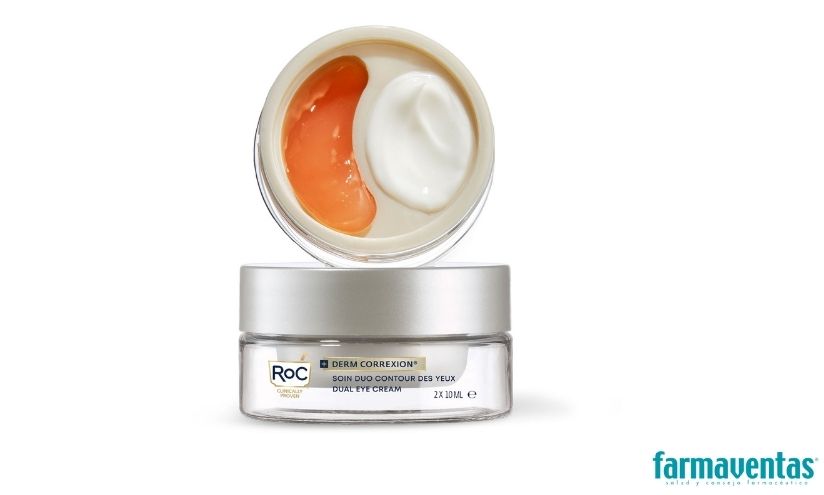 Derm Correxion® Contorno de Ojos Dual de RoC, con retinol y péptidos, es un tratamiento 2 en 1 desarrollado junto a dermatólogos y cirujanos plásticos para actuar de forma específica tanto en el párpado superior como en el contorno inferior. También suaviza líneas de expresión, reduce ojeras y aporta firmeza.