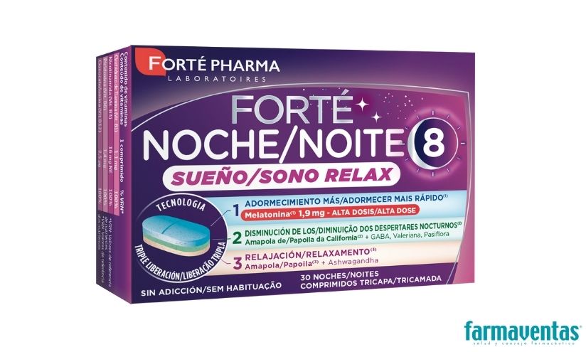 Forté Noche Sueño Relax actúa durante toda la noche gracias a una tecnología de liberación secuencial: liberación inmediata para un adormecimiento más rápido, liberación prolongada 8h para un sueño de calidad y liberación sostenida para el mantenimiento de la relajación. Diseñado para actuar en las distintas fases del sueño, presenta un formato innovador con una triple acción de activos: 1,9 mg de melatonina, que ayuda a reducir el tiempo necesario para conciliar el sueño y disminuir el estado de hiperalerta; una combinación de plantas sedantes y GABA, que favorece el sueño profundo y ayuda a evitar despertares nocturnos, y plantas relajantes, que contribuyen a disminuir los pensamientos intrusivos y facilitan un descanso mental continuo.